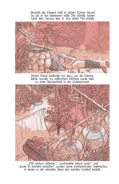 Dass Earthboi, der so alt ist wie das Leben auf der Erde selbst, sich ausgerechnet zu unserer Zeit in menschlicher Form manifestiert, kann kein Zufall sein. Er kennt die Natur und ihre Lebewesen in allen Facetten, er hat ihre Entstehung beobachtet und begleitet. Und nun betrachtet er entsetzt die verheerenden Auswirkungen des Anthropozäns auf die Natur, die nicht mehr rückgängig zu machen sind. Er entwickelt eine App, die UserInnen ein ökologisches Bewusstsein „einpflanzt“ und wird zu einem globalen Anführer, einer Art Messias, dessen Anhängerschar stetig wächst. Ist die Rettung des Planeten vereinbar mit der Rettung der Menschheit?