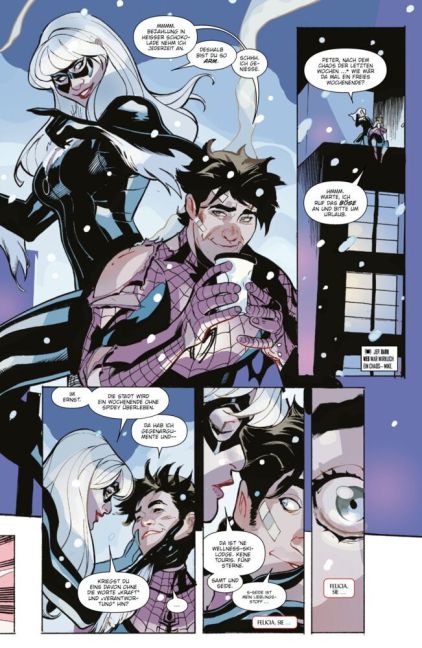 Netzschwinger Spider-Man und seine Flamme Black Cat wollen ein romantisches Wochenende als Peter und Felicia verbringen. Doch im verschneiten Spa treffen sie Petes Ex Mary Jane und deren neuen Freund Paul - und eine Bande Superschurken! Zudem wird endlich enthüllt, welche mystisch-kosmische Mathematik des Wahnsinns zur Trennung von Pete und MJ und zum Ärger zwischen Spidey und den Fantastic Four geführt hat.